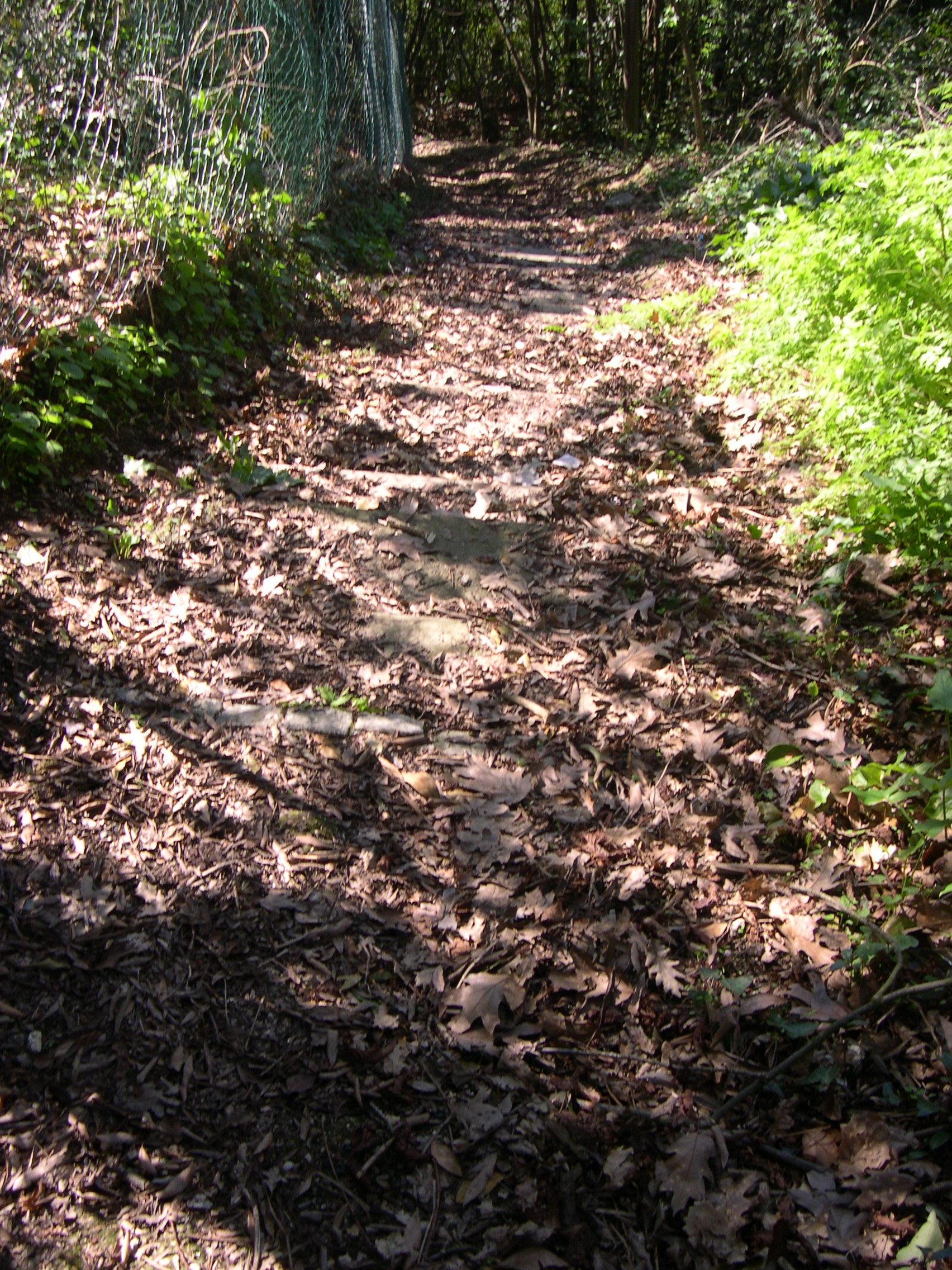 A gauche, domaine Bellevue. Une grille interdit, actuellement, le passage, à cause d'un éboulement important sur la droite. |