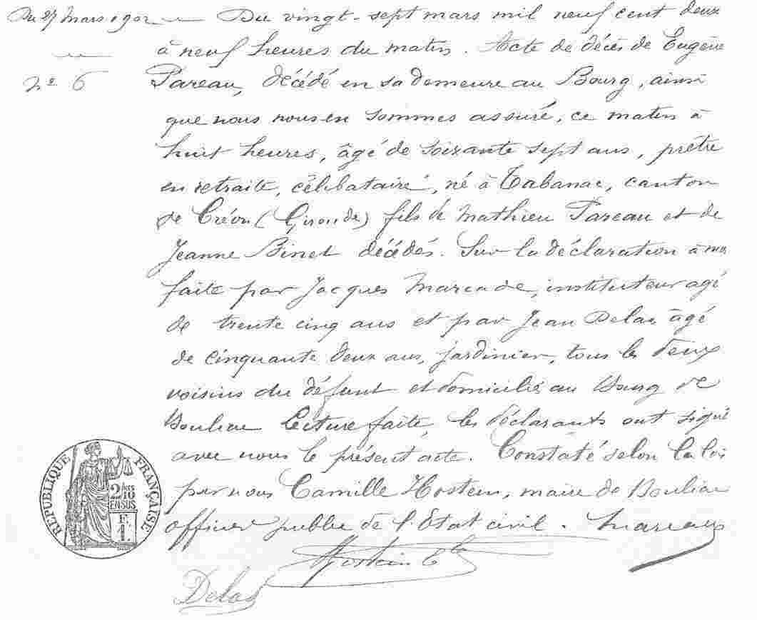 Eugène Pareau, prêtre retraité, est mort à Bouliac le 27 mars 1902, à l'âge de 67 ans.