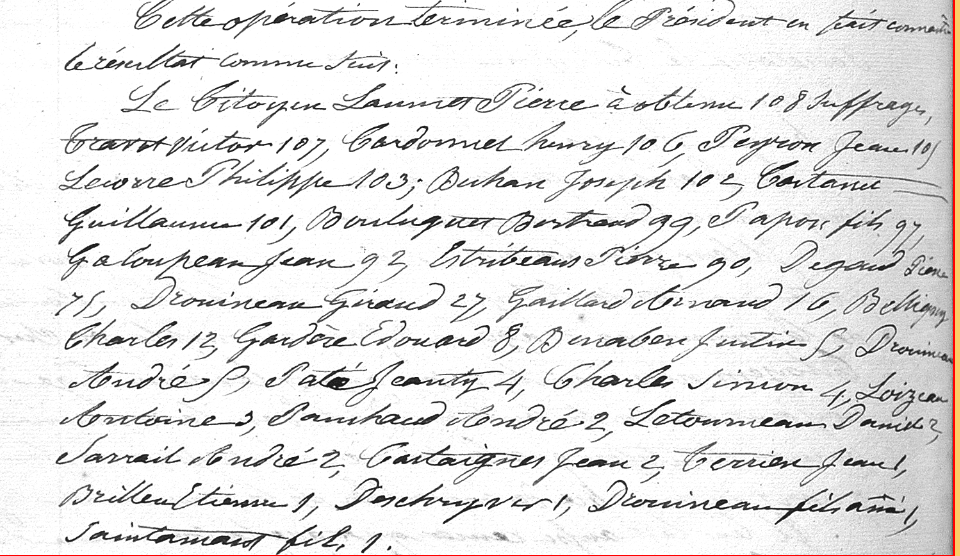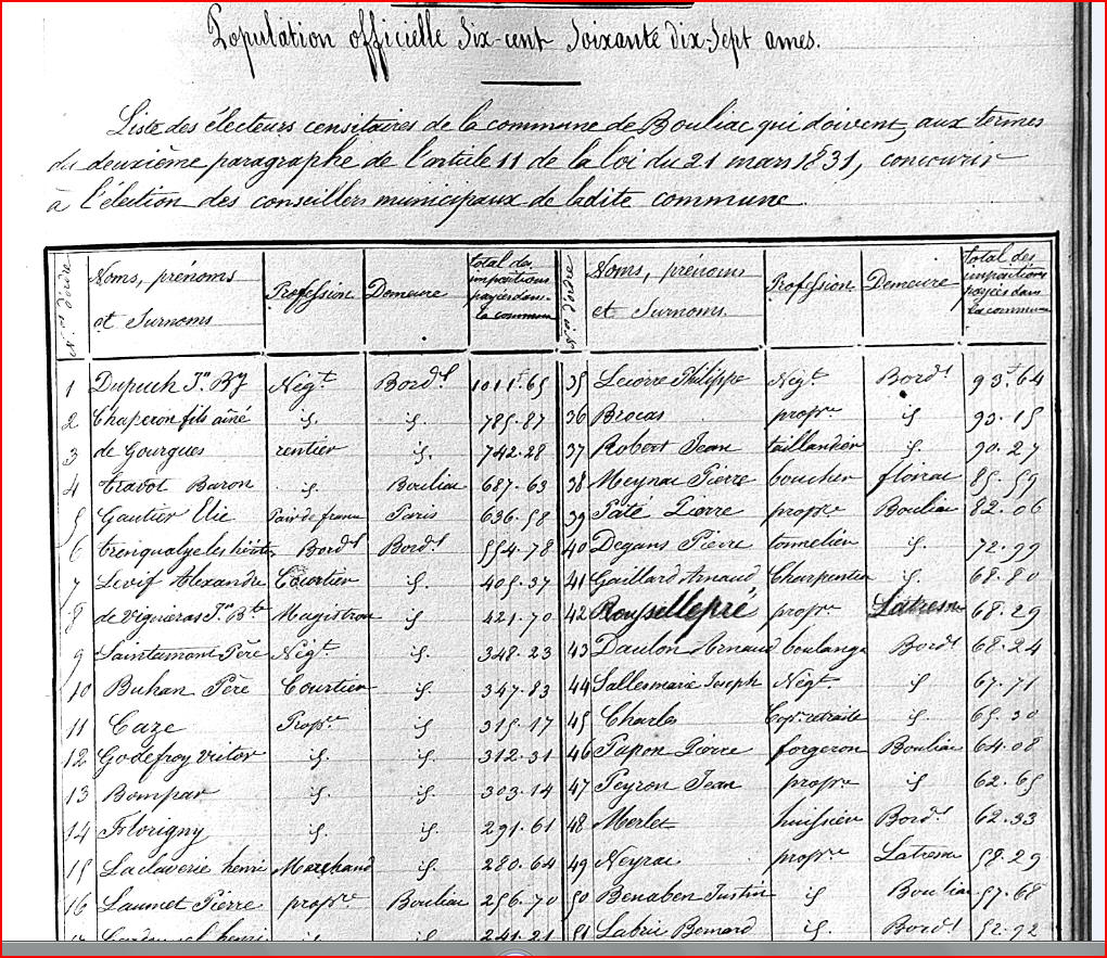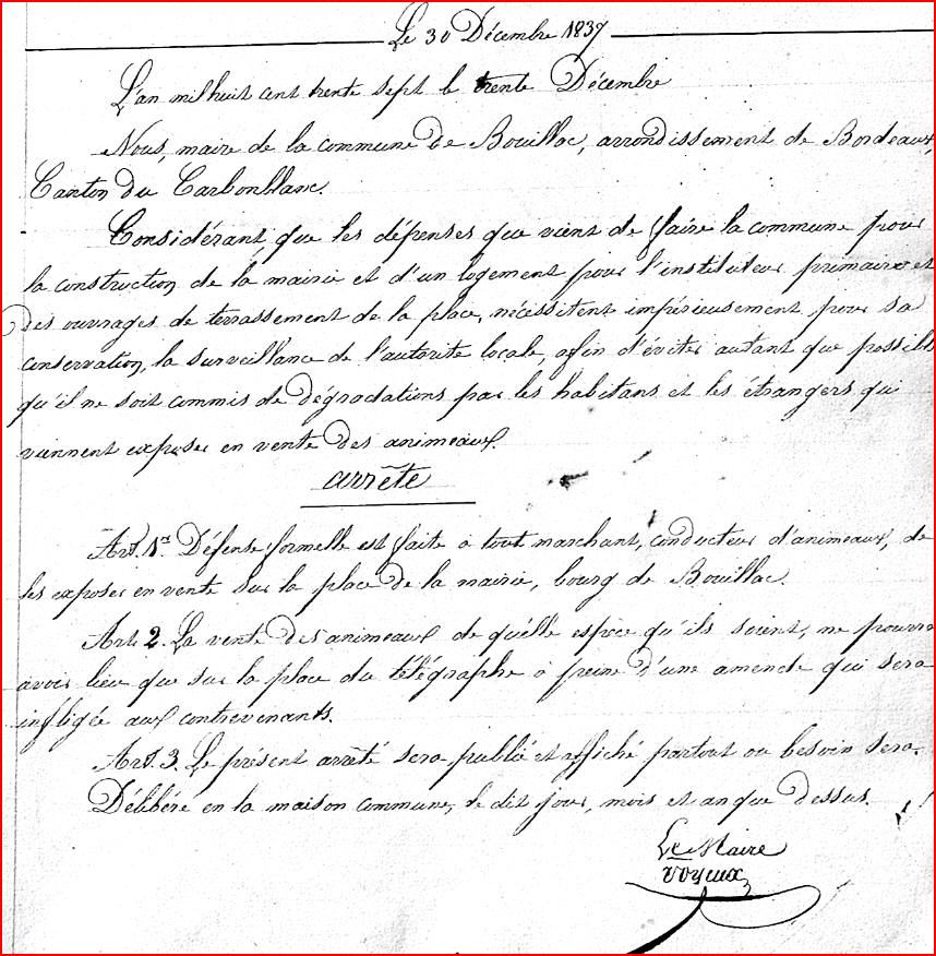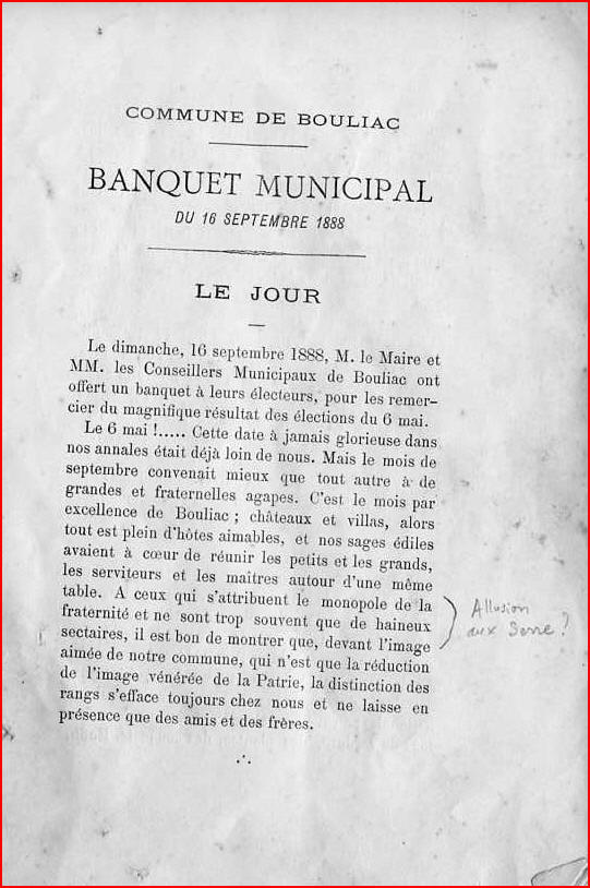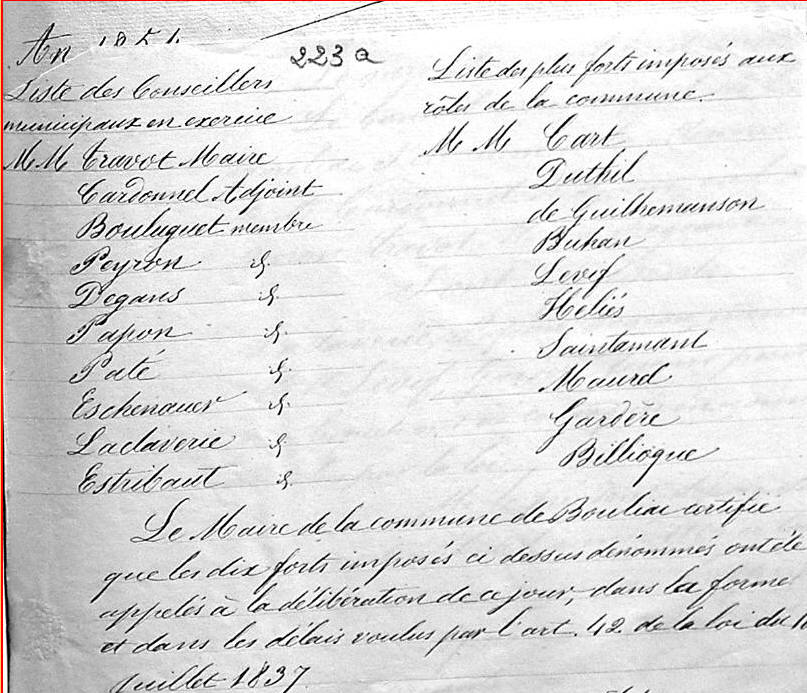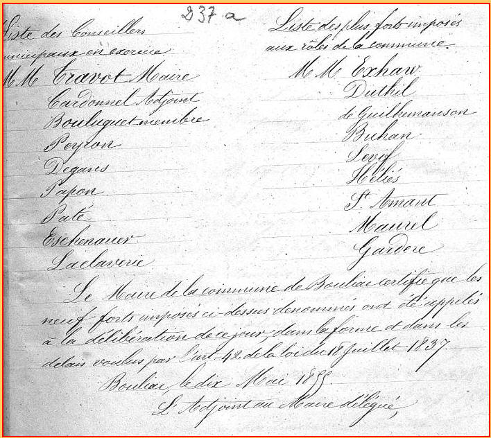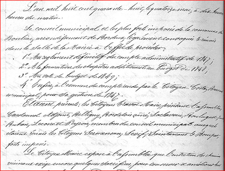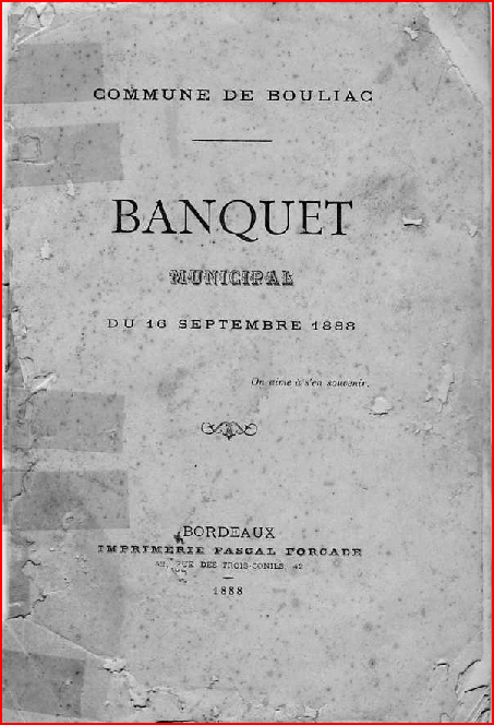 Tous les documents municipaux de la période 1789 -1828 ont disparu des archives communales. Pour cette période, les informations données ici sont, le plus souvent, tirées de l'ouvrage de l'abbé Pareau "Bouliac au XIXeme siècle" . Pour les années postérieures à 1828, j'ai utilisé l'ouvrage de l'abbé Pareau et les archives municipales.