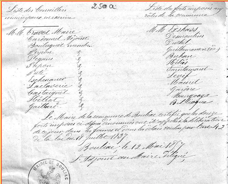 Tous les documents municipaux de la période 1789 -1828 ont disparu des archives communales. Pour cette période, les informations données ici sont, le plus souvent, tirées de l'ouvrage de l'abbé Pareau "Bouliac au XIXeme siècle" . Pour les années postérieures à 1828, j'ai utilisé l'ouvrage de l'abbé Pareau et les archives municipales.